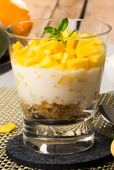 Die Gläser etwa 15 Minuten vor dem Servieren aus dem Kühlschrank nehmen, damit sich das Aroma entfalten kann. Die kleingeschnittene Mango auf die 3 Gläser verteilen und jedes Dessert mit einem Minzeblättchen garnieren.