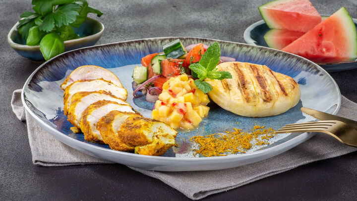 Gegrillte Curry-Hähnchenbrust mit Mango-Chutney dazu Wassermelonen-Gurken-Salat