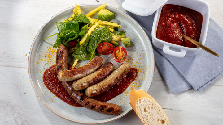 Grillwürstchen mit Currysauce und Sommersalat