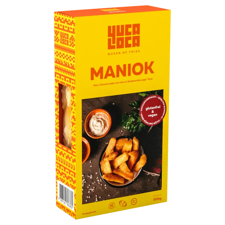 Backofen auf 200°C Ober-/Unterhitze vorheizen. Maniok Fritten aus der Verpackung holen und in eine Schüssel geben. Rapsöl drüber geben und alles gut vermengen.