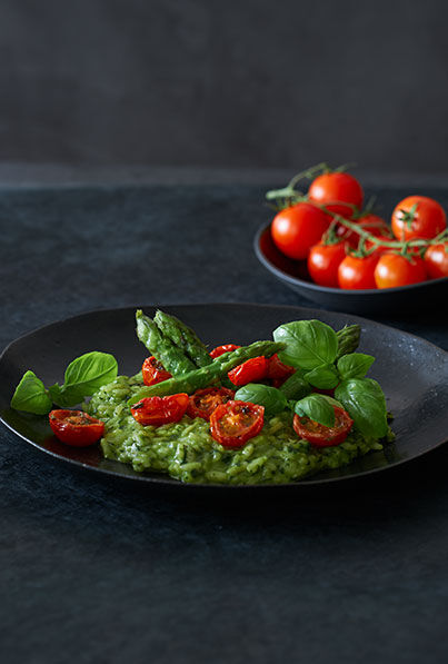 Kräuterrisotto mit Gewürztomaten und grünem Spargel