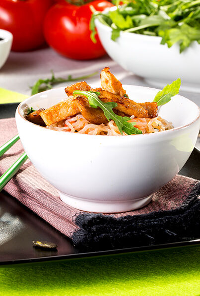 Während die Sauce köchelt, in einer weiteren Pfanne das restliche Olivenöl erhitzen, darin die ProViand Filetstreifen unter Wenden knusprig braten, mit Salz und Pfeffer würzen.