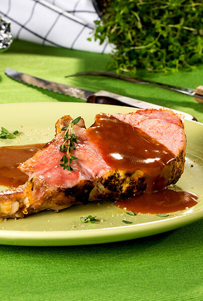 Das Fleisch wieder in den Bräter legen, in den vorgeheizten Backofen geben und etwa 3 Stunden bei Niedrigtemperatur garen. Zwischendurch prüfen – die Kerntemperatur des fertigen Karrees sollte bei 75–80 °C liegen.