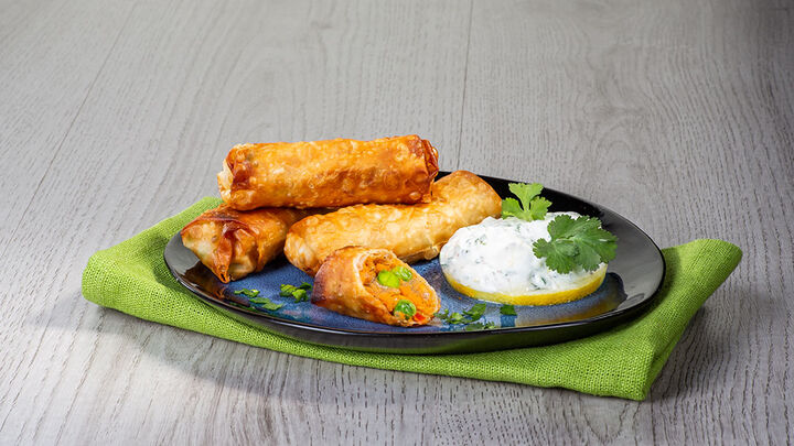 Selbstgemachte Frühlingsrollen mit Süßkartoffel-Gemüse-Füllung dazu Zitronen-Koriander-Joghurt