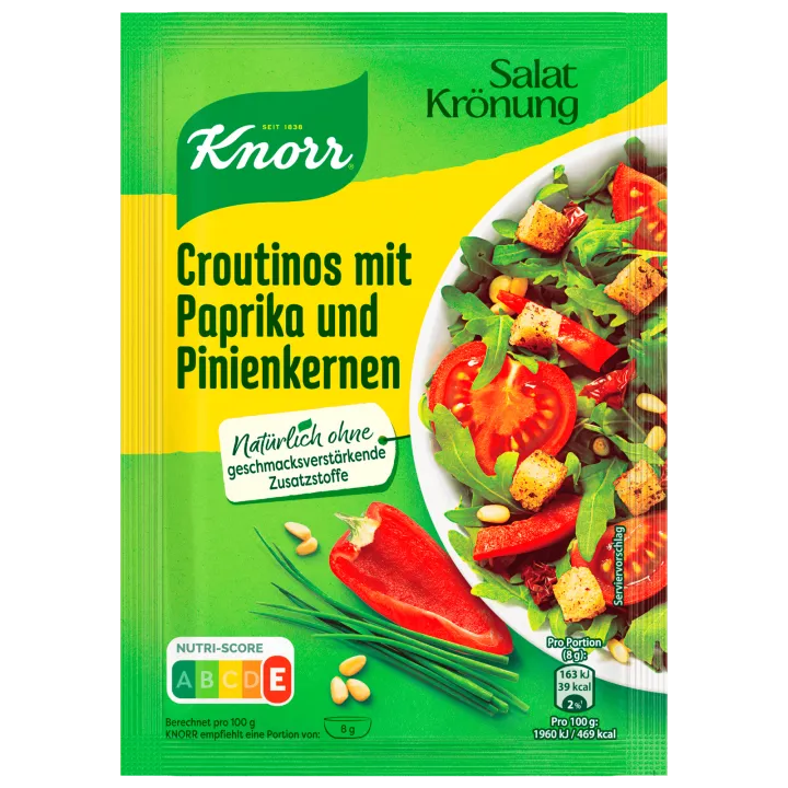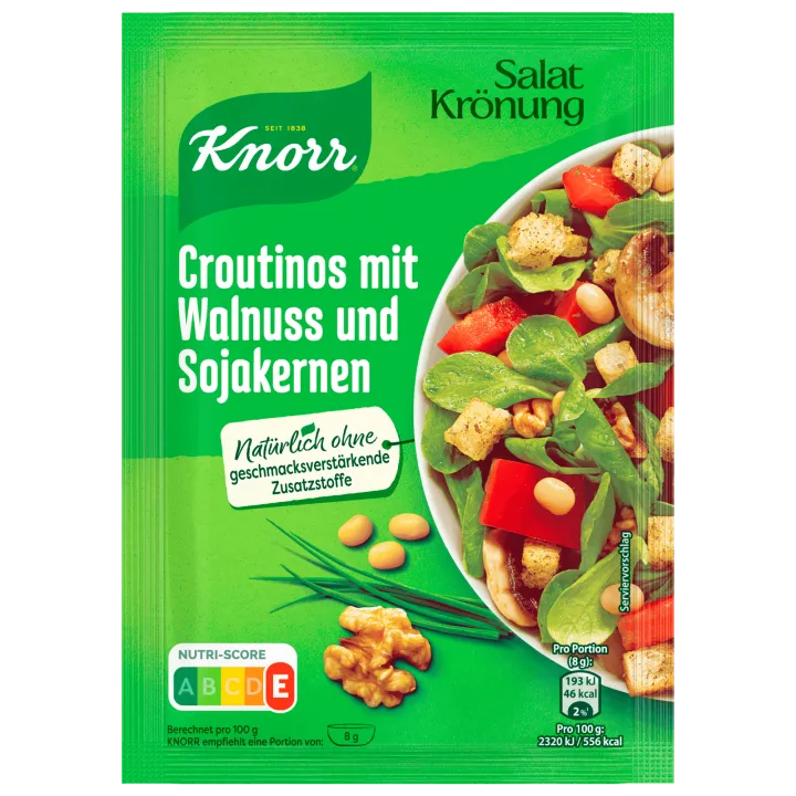 Feldsalat waschen und sortieren, dann trocknen. Knorr Salatkrönung nach Anleitung des Herrstellers mit Olivenöl und Wasser zubereiten.