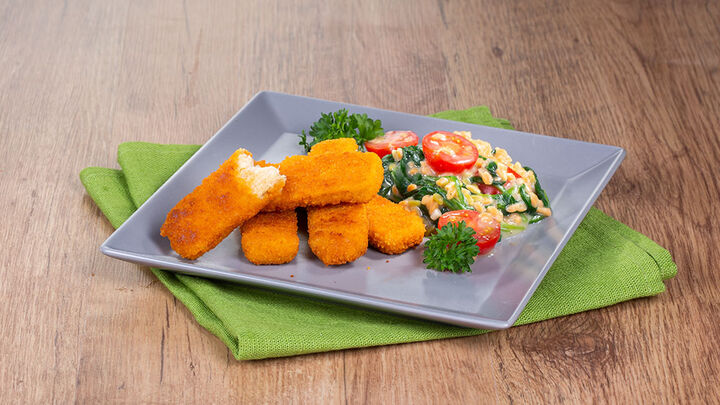 Vegane Fischstäbchen mit Nudeln in Spinatsauce