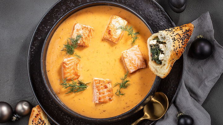 Lachscremesuppe mit frischen Lachswürfeln dazu Spinat-Feta-Taschen