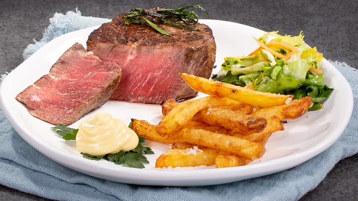 Hauptspeisen Rinderfilet mit selbstgemachten Pommes frites dazu Salat in Honig-Senf-Dressing 105 min 727 kcal p. Portion Mittel