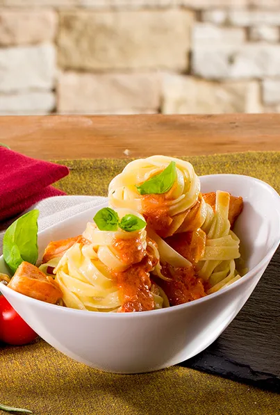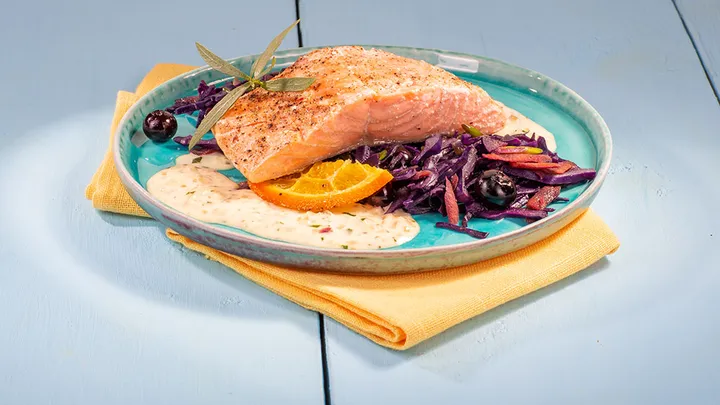 Hauptspeisen Lachsfilet auf Haut mit Orangen im Ofen gegart mit gedünstetem Blaubeer-Rotkohl und Estragon-Senf Sauce 65 min 772 kcal p. Portion Leicht
