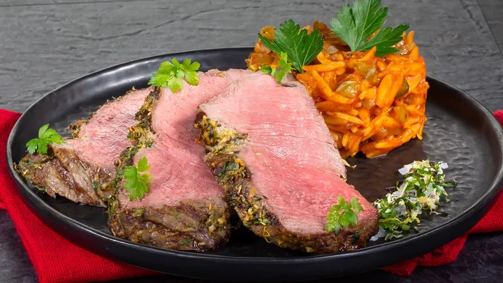 Hauptspeisen Roastbeef mit leichter Currysauce dazu gebackene Kürbisspalten 70 min 654 kcal p. Portion Leicht