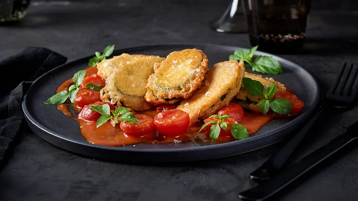 Hauptspeisen Valess Gouda Schnitzel Caprese mit Bohnensalat 40 min 1.127 kcal p. Portion Leicht Vegetarisch