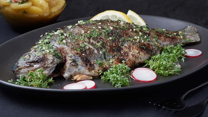 Hauptspeisen Geräuchertes Forellenfilet mit rotem Salat und Meerrettich 90 min 722 kcal p. Portion Mittel