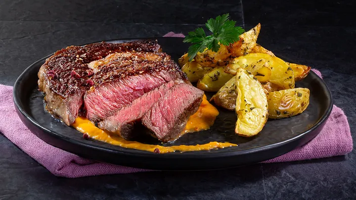 Hauptspeisen Argentinisches Entrecote mit fruchtiger Paprika-Rahm Sauce und Ofenkartoffeln 75 min 869 kcal p. Portion Leicht