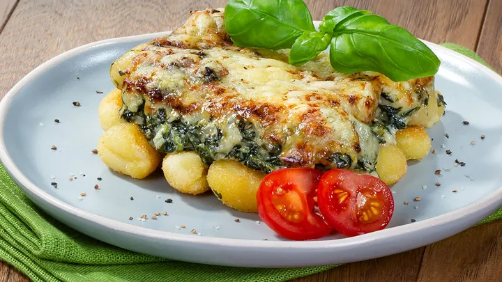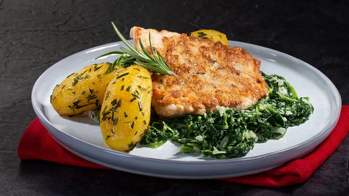 Hauptspeisen Schweinesteaks auf Spinat mit Gorgonzola-Rahm dazu Rosmarin-Kartoffeln 60 min 1.078 kcal p. Portion Leicht