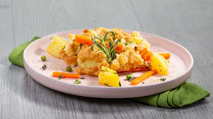Lammlachse mit Kräuterkruste an Drillingen aus dem Ofen und Bohnen im Speckmantel