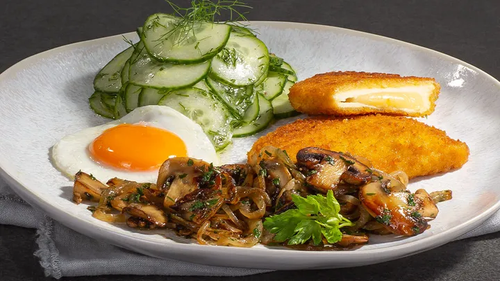 Hauptspeisen Valess Schnitzel Gouda Holzfäller Art mit Gurkensalat 35 min 587 kcal p. Portion Leicht Vegetarisch