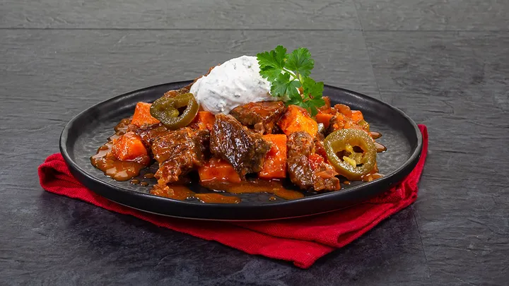 Hauptspeisen Feurig scharfes Jungbullen-Gulasch mit sahnigem Kräuter-Crème-fraîche 180 min 1.149 kcal p. Portion Leicht